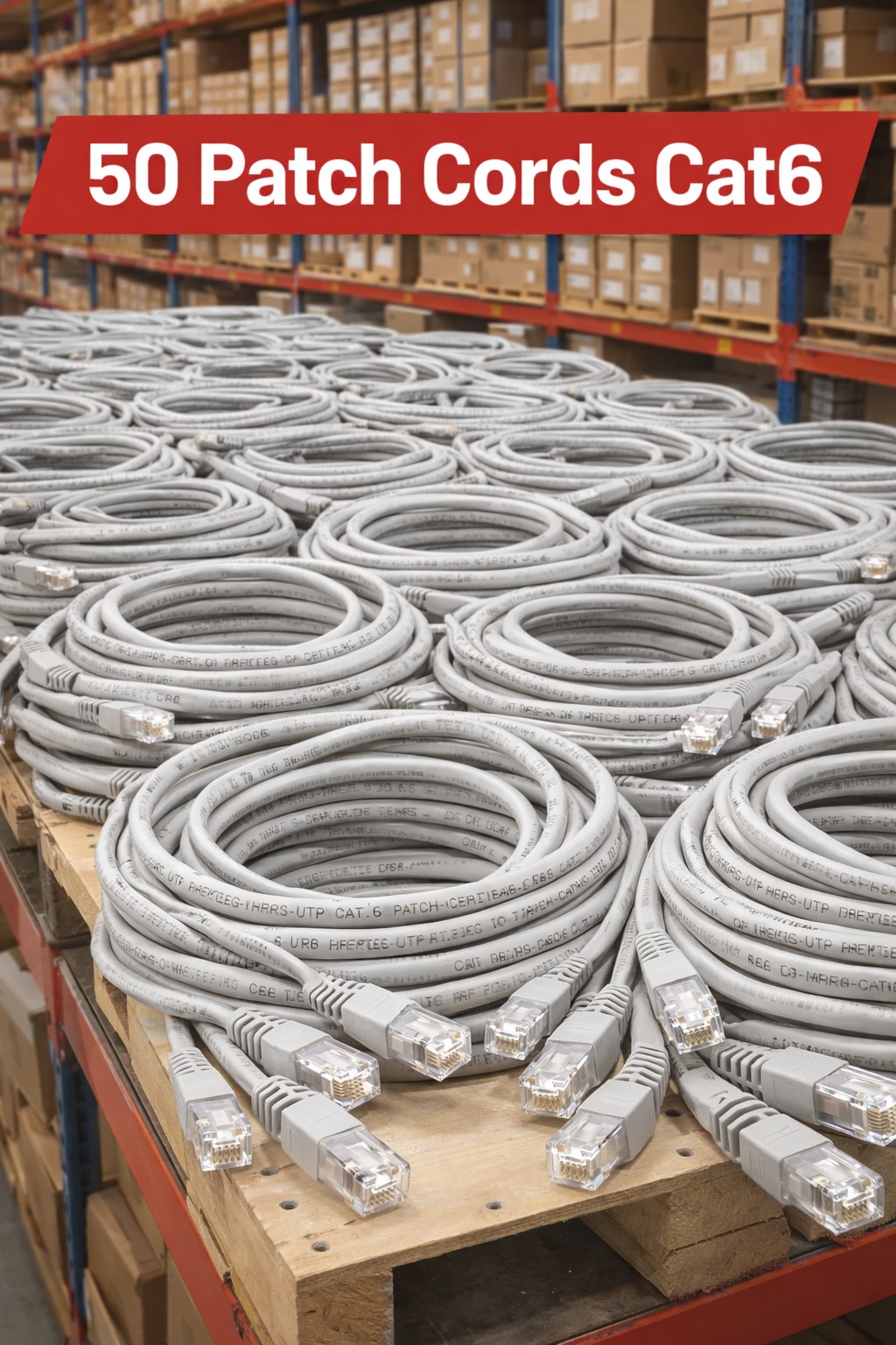 Paquete de 50 patch cords Cat6 UTP de 5 metros, ideal para instalaciones profesionales de red en oficinas, racks y centros de datos.